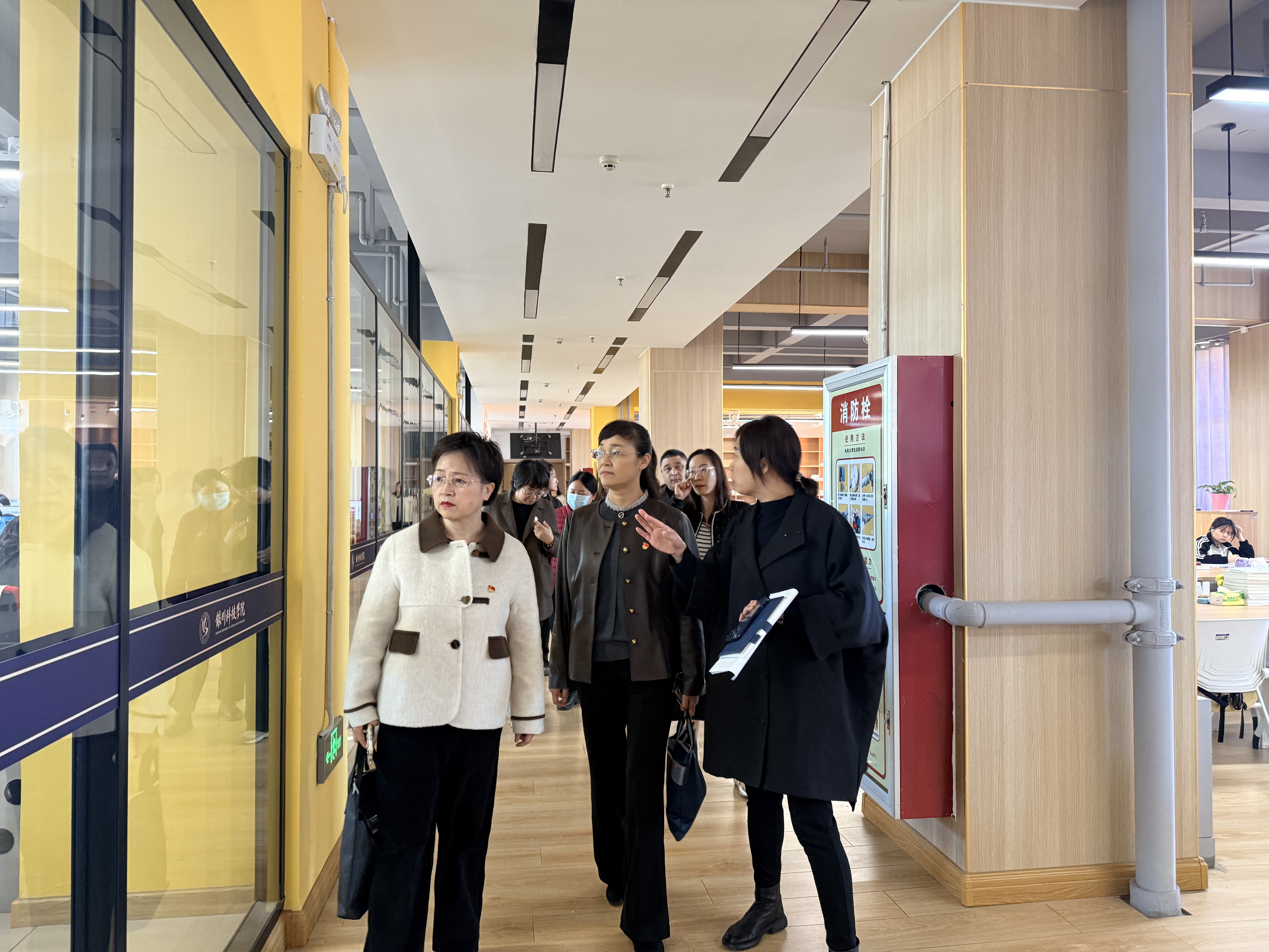 包海燕书记一行先实地参观了图书馆的借阅区、阅览室以及正在建设的密集书库等功能区域。参观过程中,双方边走边交流,详细了解馆内空间布局、馆藏管理、服务流程等情况,对学校图书馆优美的阅读环境和高效的管理模式给予高度评价。